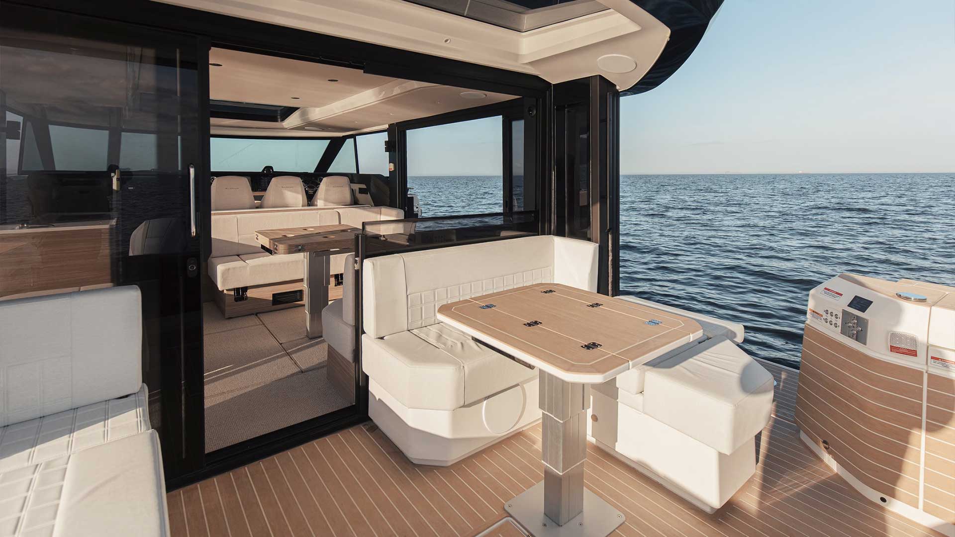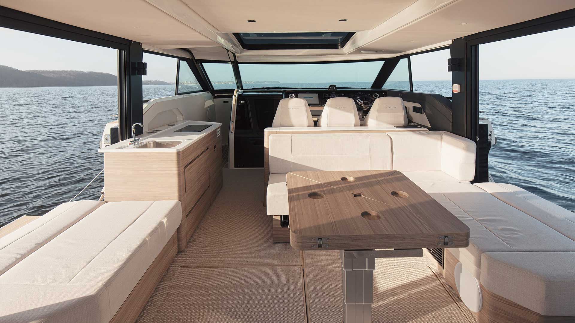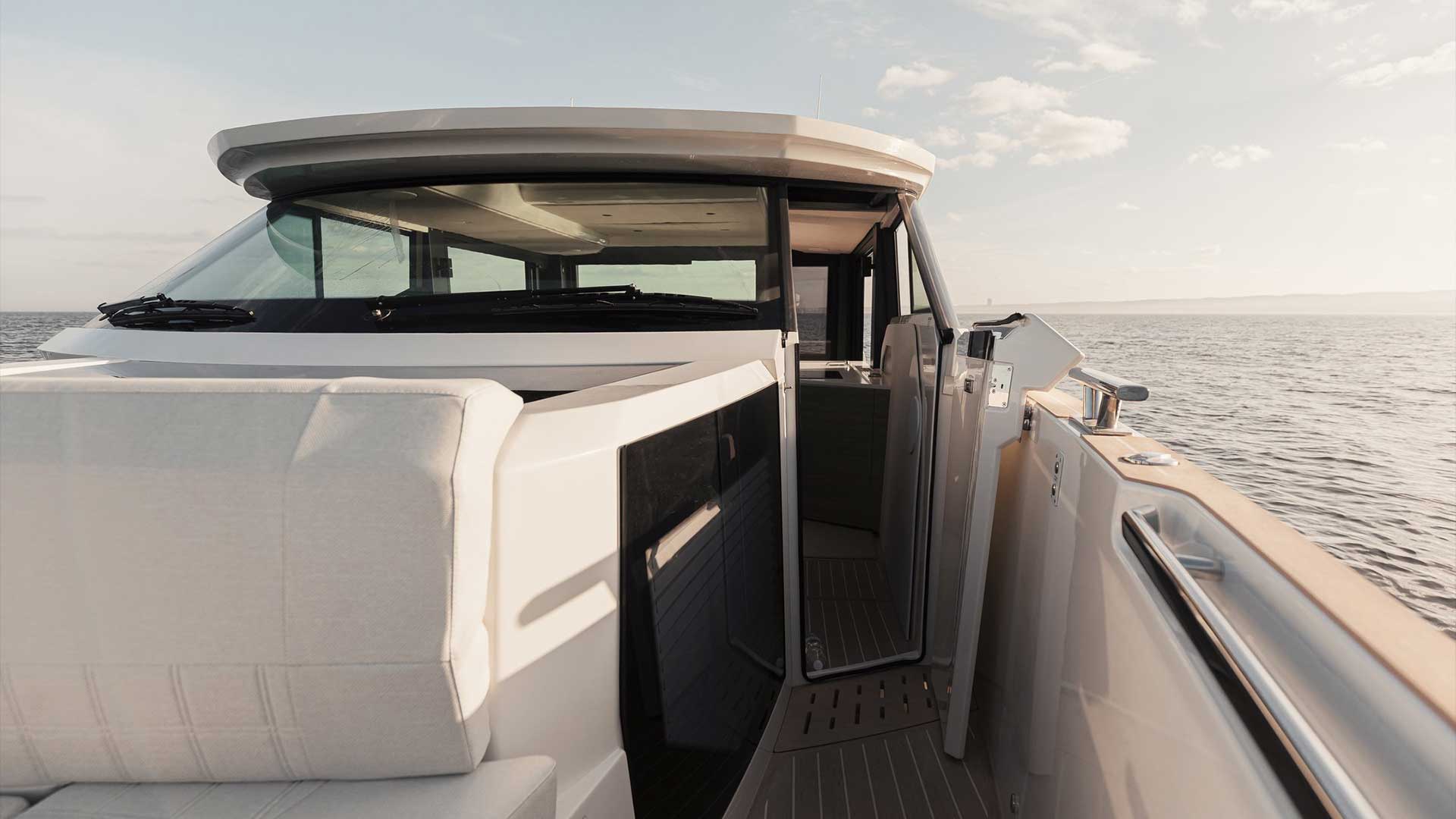 Saxdor 460 GTC, kendine özgü siluetimizi şimdiye kadarki en büyük ve en gelişmiş modelimize taşıyor. Amiral gemisi, tamamen kapatılabilen ya da tamamen açılabilen, tam genişlikte bir dümen evi bulunan dıştan takma motorlu bir yat olarak tasarlandı. Kapılar kapalıyken sakin, aydınlık ve ferah bir ortam sunar; dümen mahallinden dineteye kadar geniş görüş açıları sağlar. Açıldığında ise çizgiler adeta ortadan kaybolur.